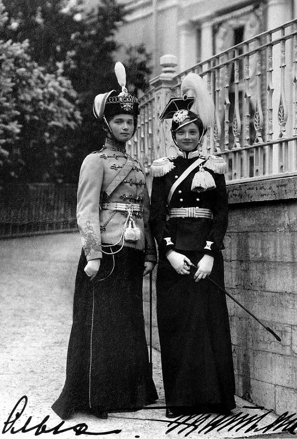 Великие княжны Ольга и Татьяна Николаевны в мундирных платьях своих подшефных лейб-гвардейских полков. Ольга (слева) в униформе 3-его гусарского Елисаветградского Её Императорского Высочества Великой Княжны Ольги Николаевны полка (с 1909 по 1917), а Татьяна (справа) в униформе 8-ого уланского Вознесенского Ея Императорского Высочества Великой Княжны Татьяны Николаевны полка (с 1911 по 1917), и как раз на голове у нее парадная каска-уланка. Петергоф, 5 августа 1913 года. Фотоателье «К.Е. Ган и Ко». Царское Село. Внизу автографы великих княжен Ольги и Татьяны Николаевны. ГА РФ. Ф.601. Оп.1. Д.2162. Л.14